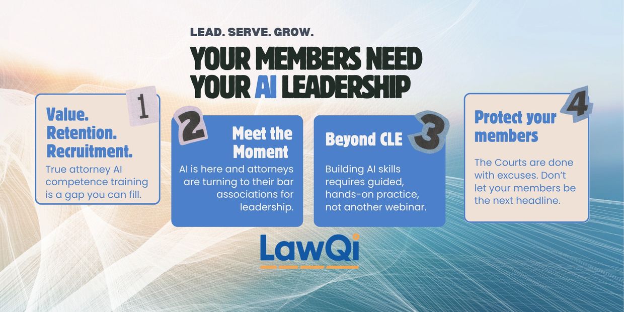 We provide bar and other legal associations with the structural capacity to lead their members and to build AI competency through all corners of the legal profession and legal industry. Our turn-key solution delivers the essential hands-on training legal professionals need now.
